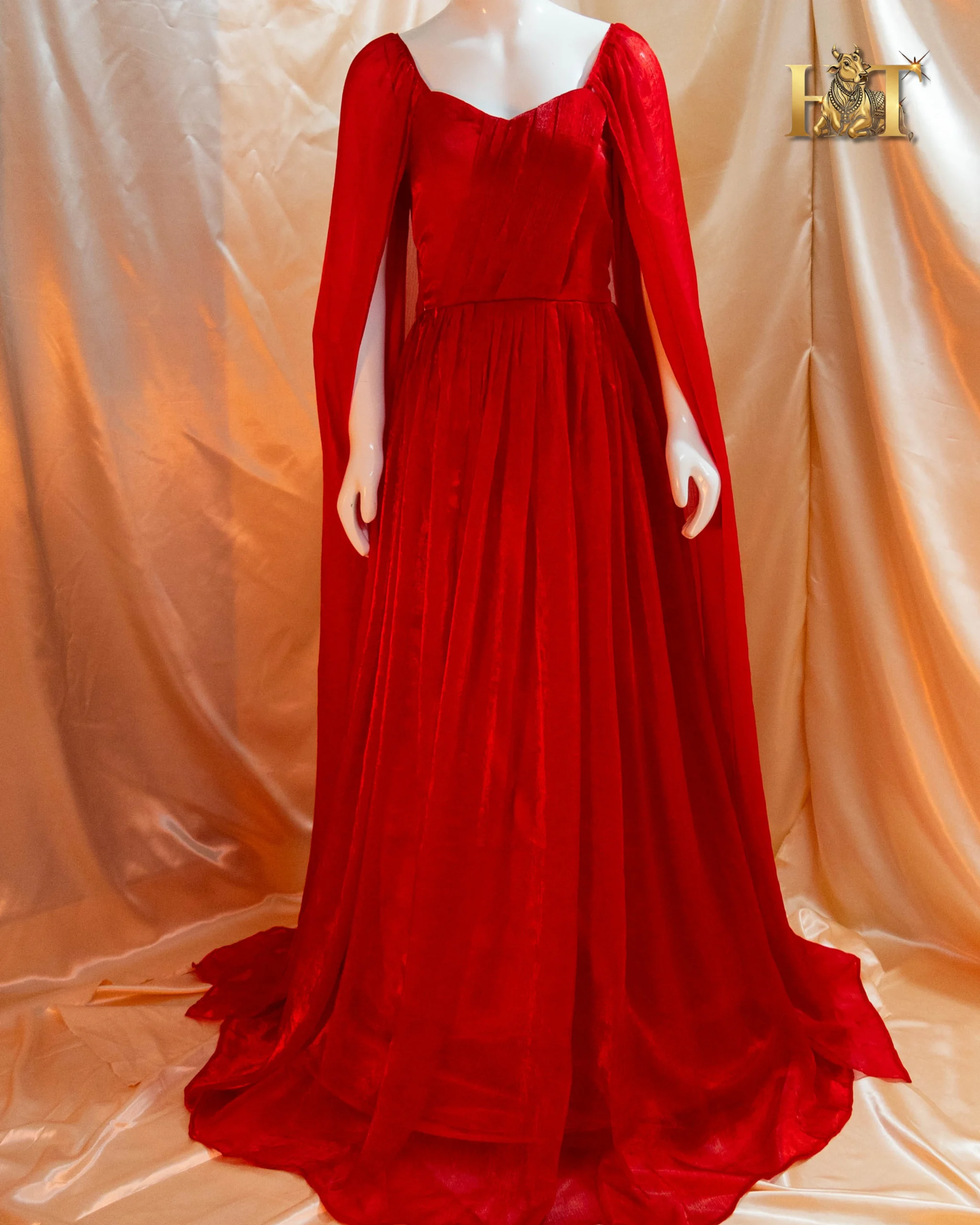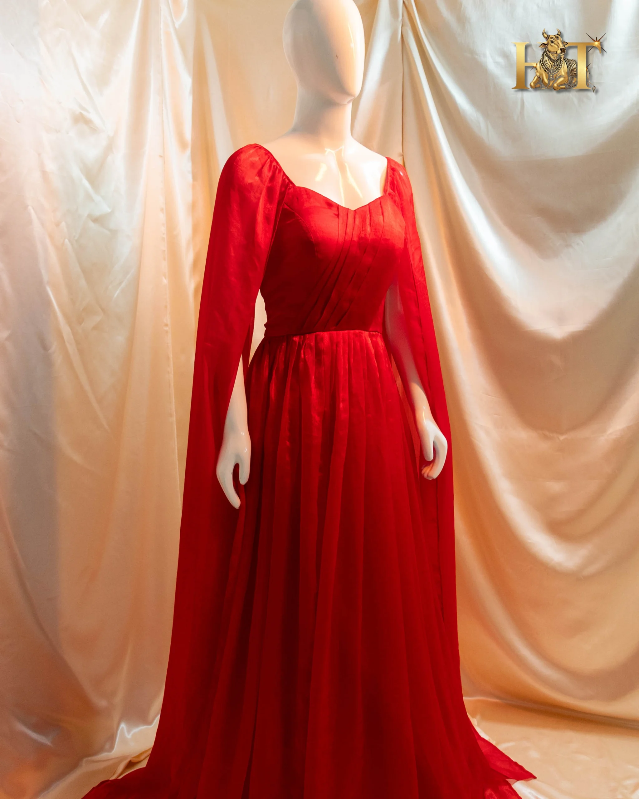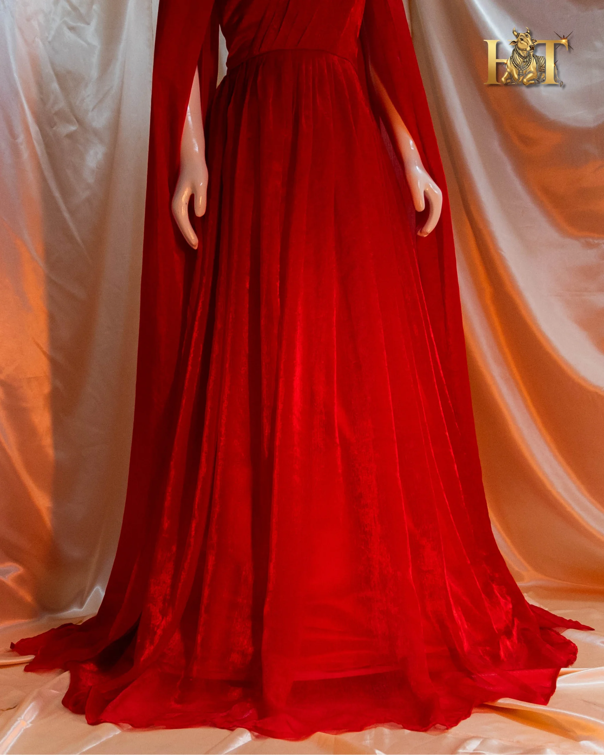 The flared sleeves add drama and fluidity, while the structured bodice and flowing silhouette sculpt an elegant, confident look, perfect for parties, high-end events, or red-carpet appearances.