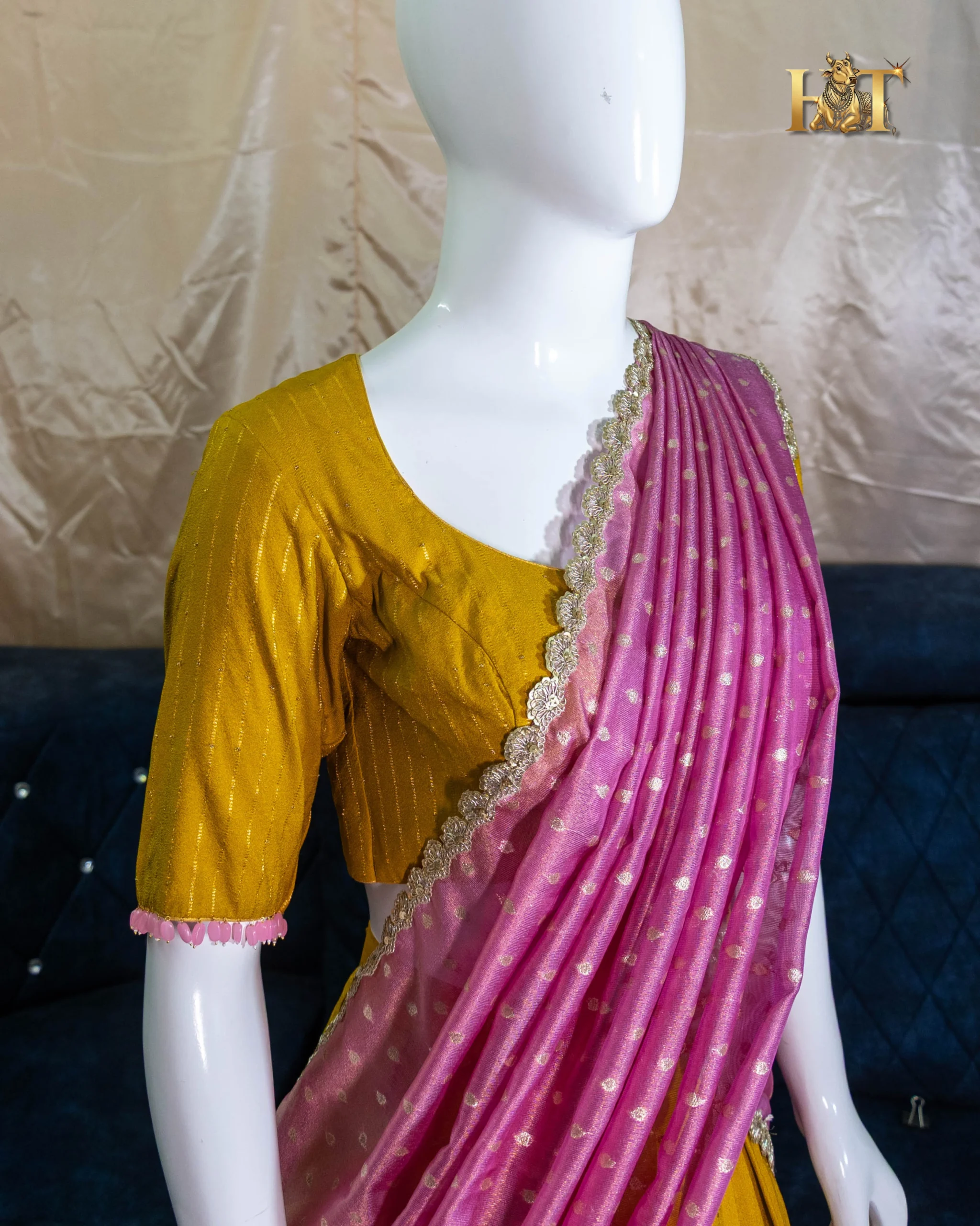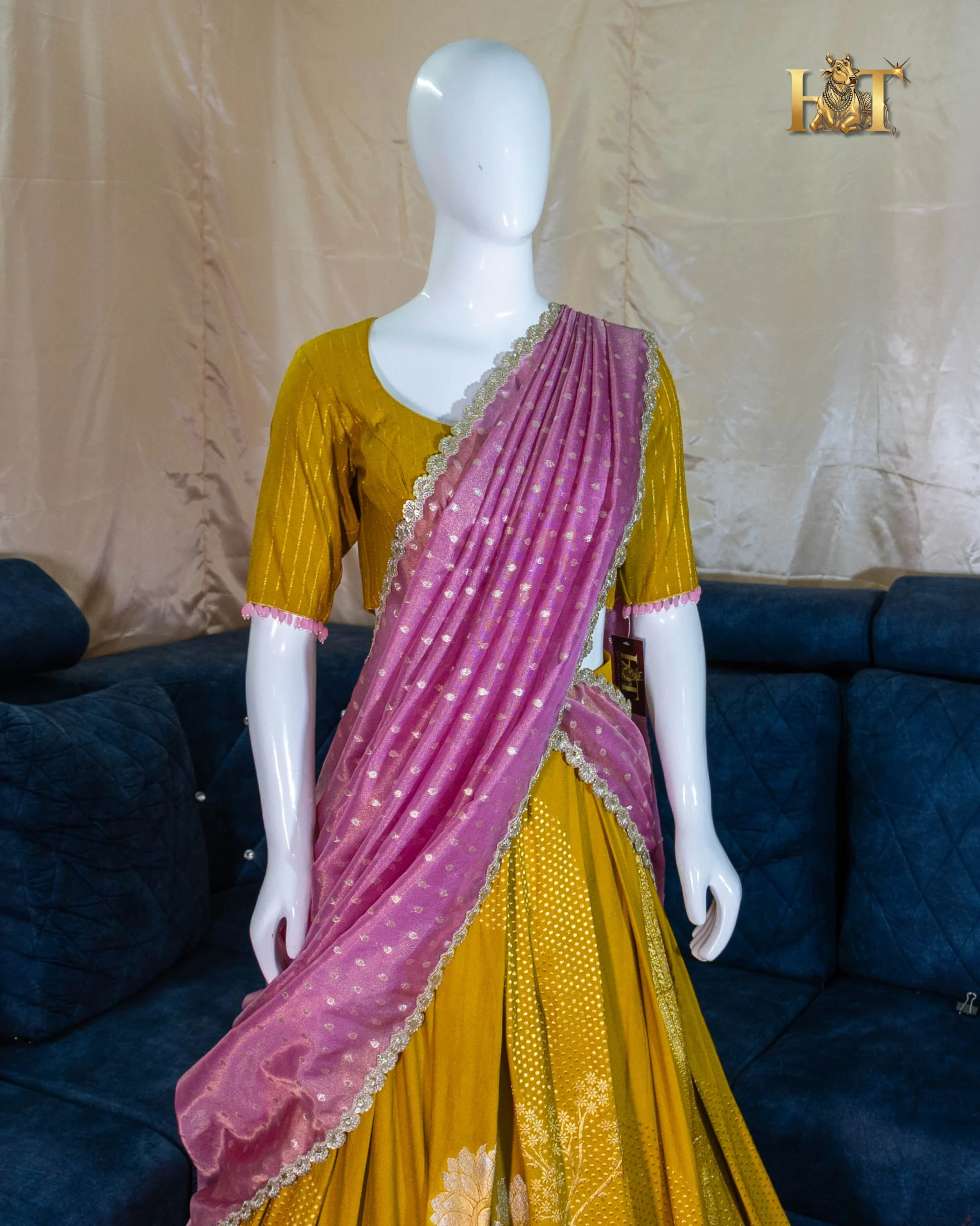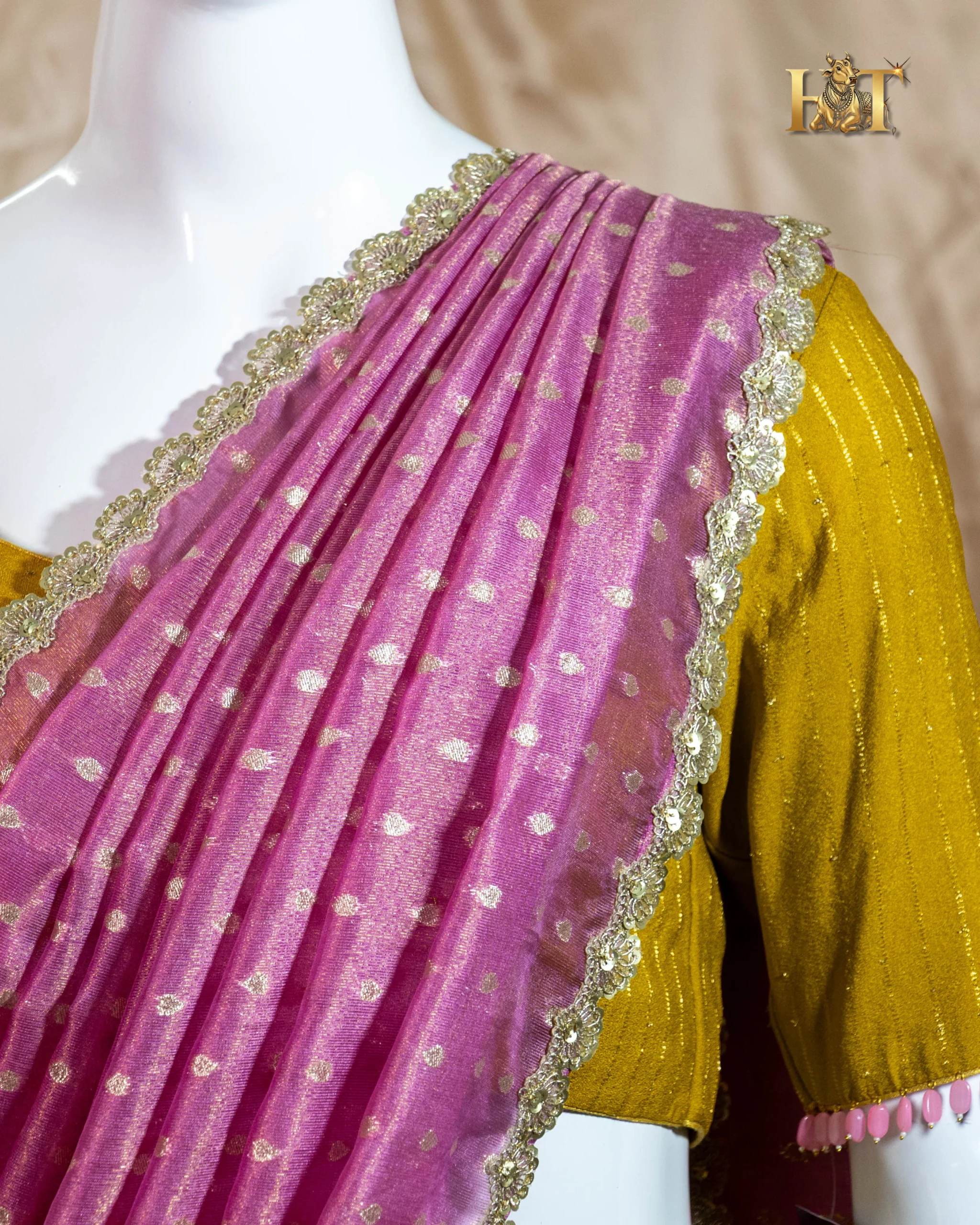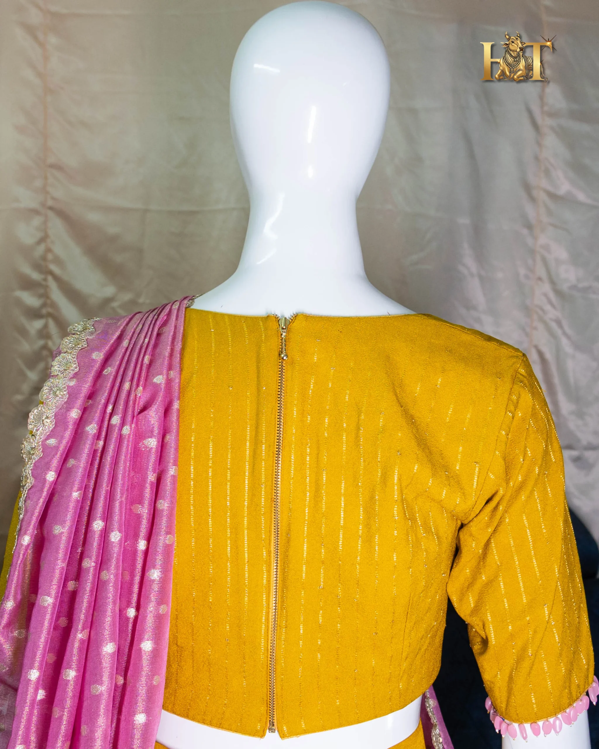 The contrasting pink dupatta, detailed with a shimmering border, adds a pop of elegance to the lehenga’s rich golden tone, creating a mesmerizing balance of color, texture, and tradition.