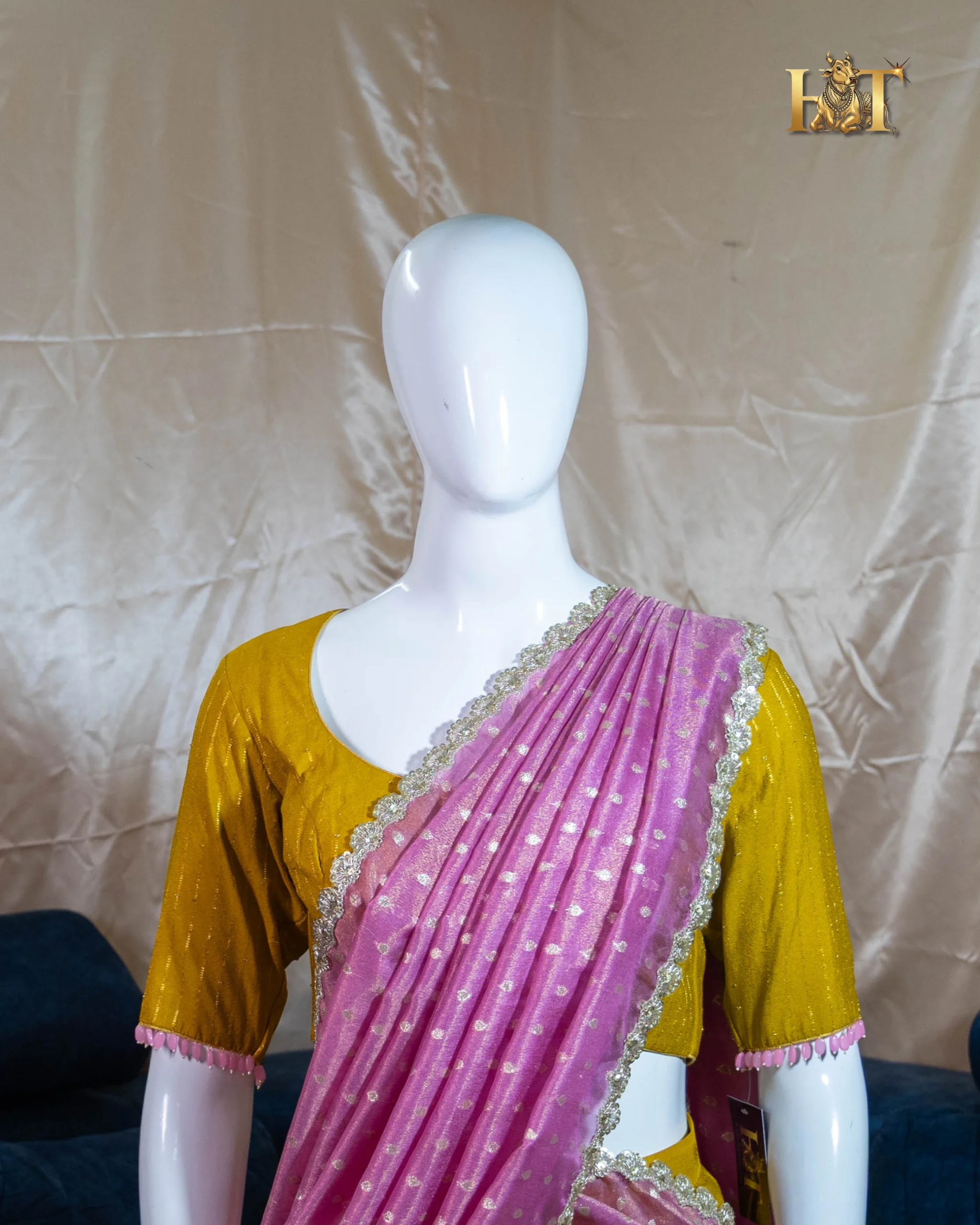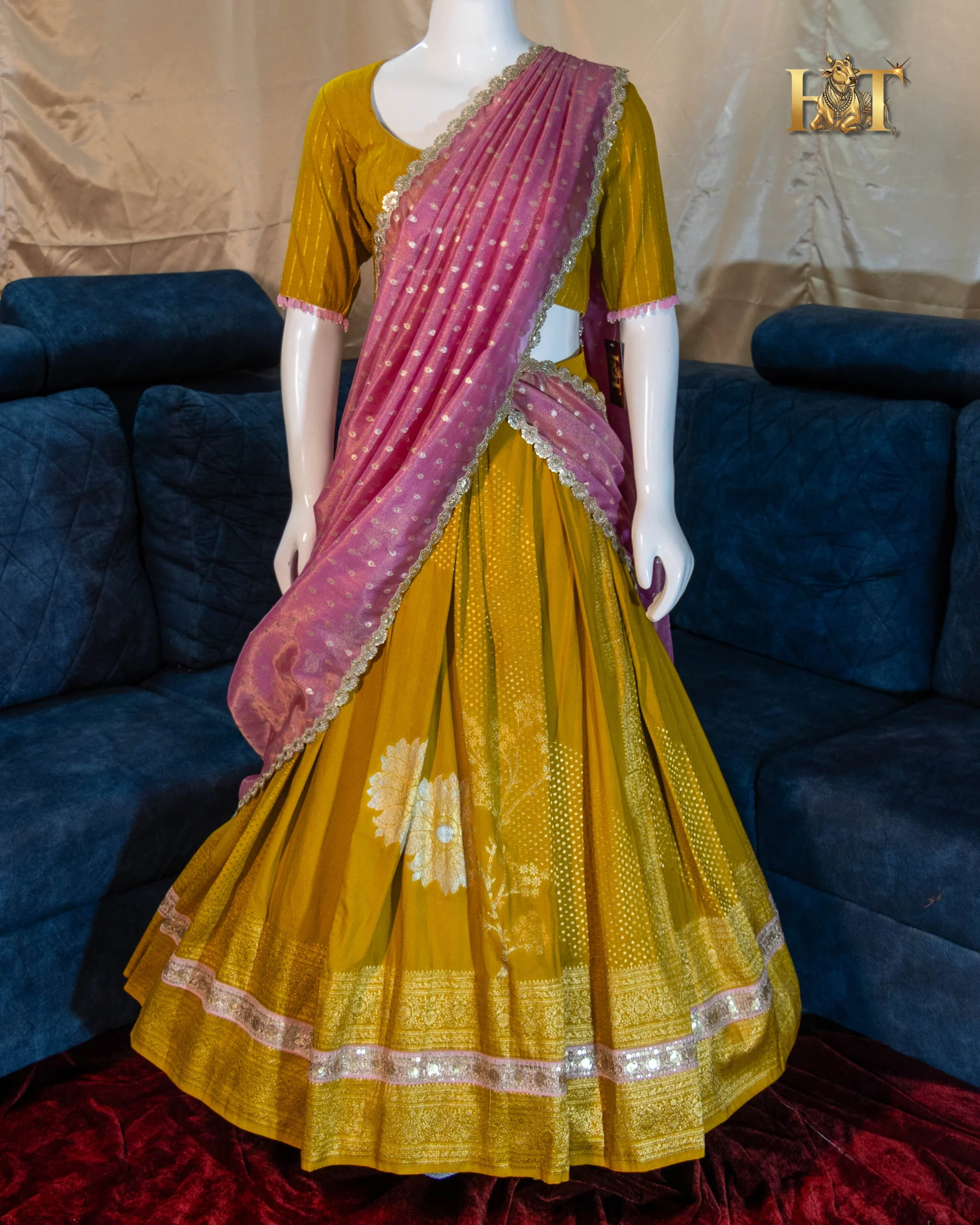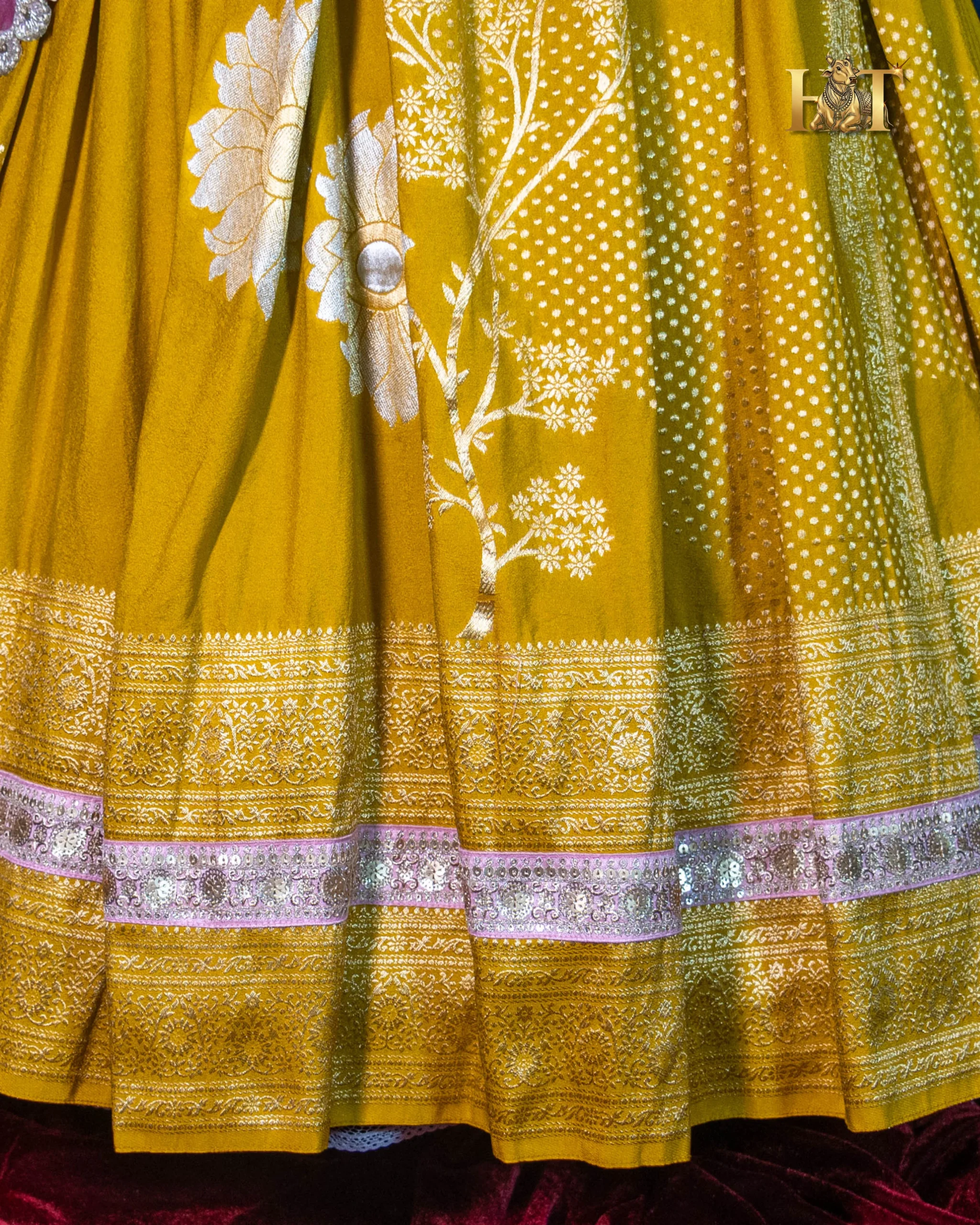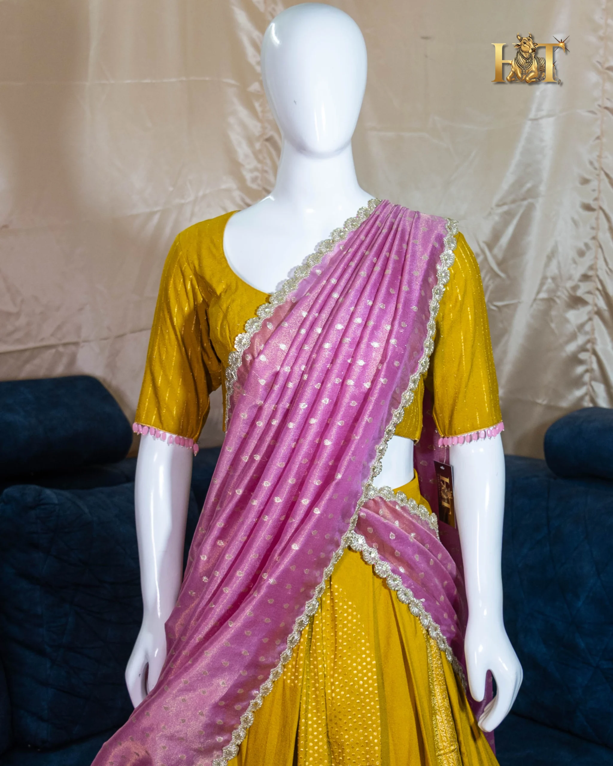 The contrasting pink dupatta, detailed with a shimmering border, adds a pop of elegance to the lehenga’s rich golden tone, creating a mesmerizing balance of color, texture, and tradition.