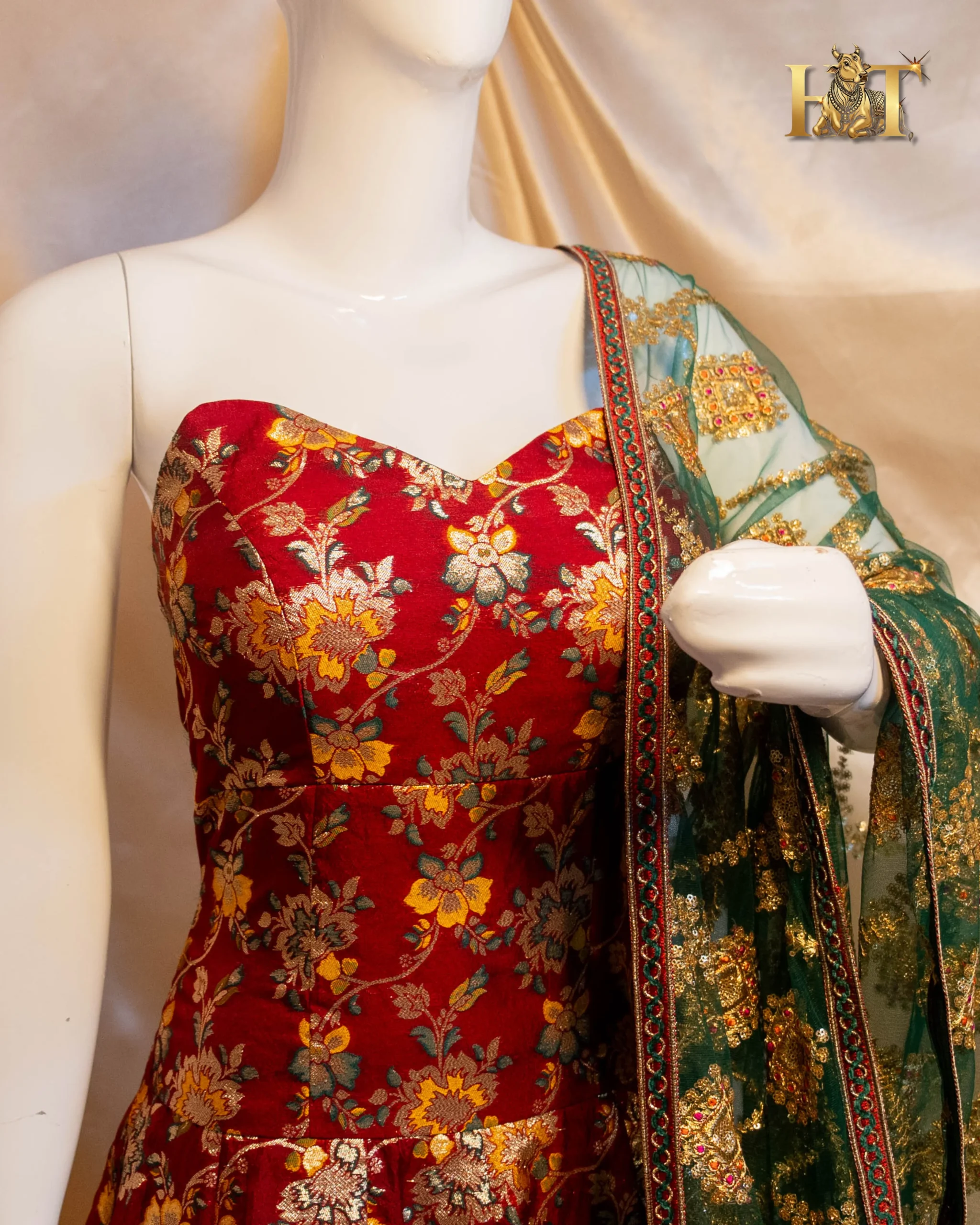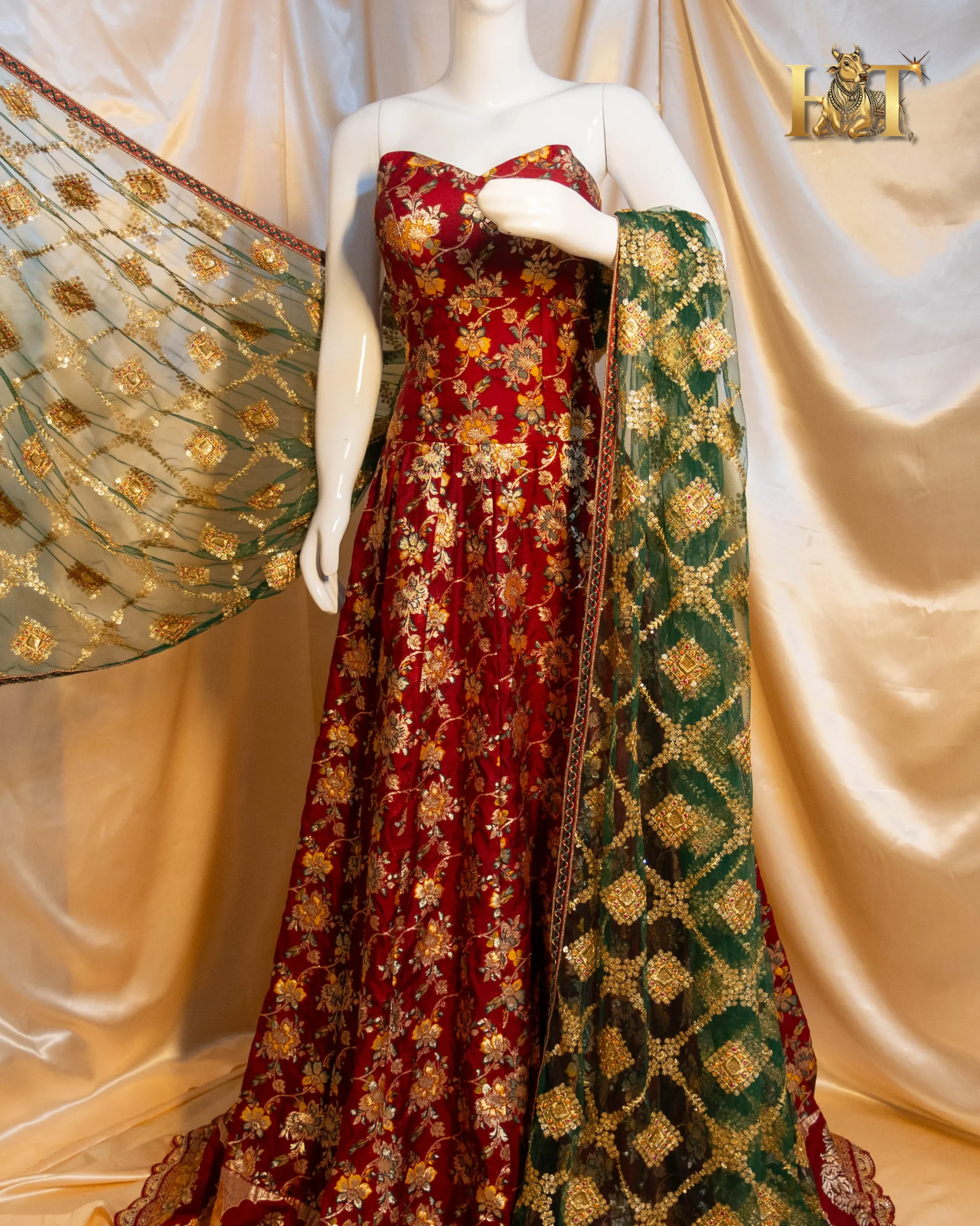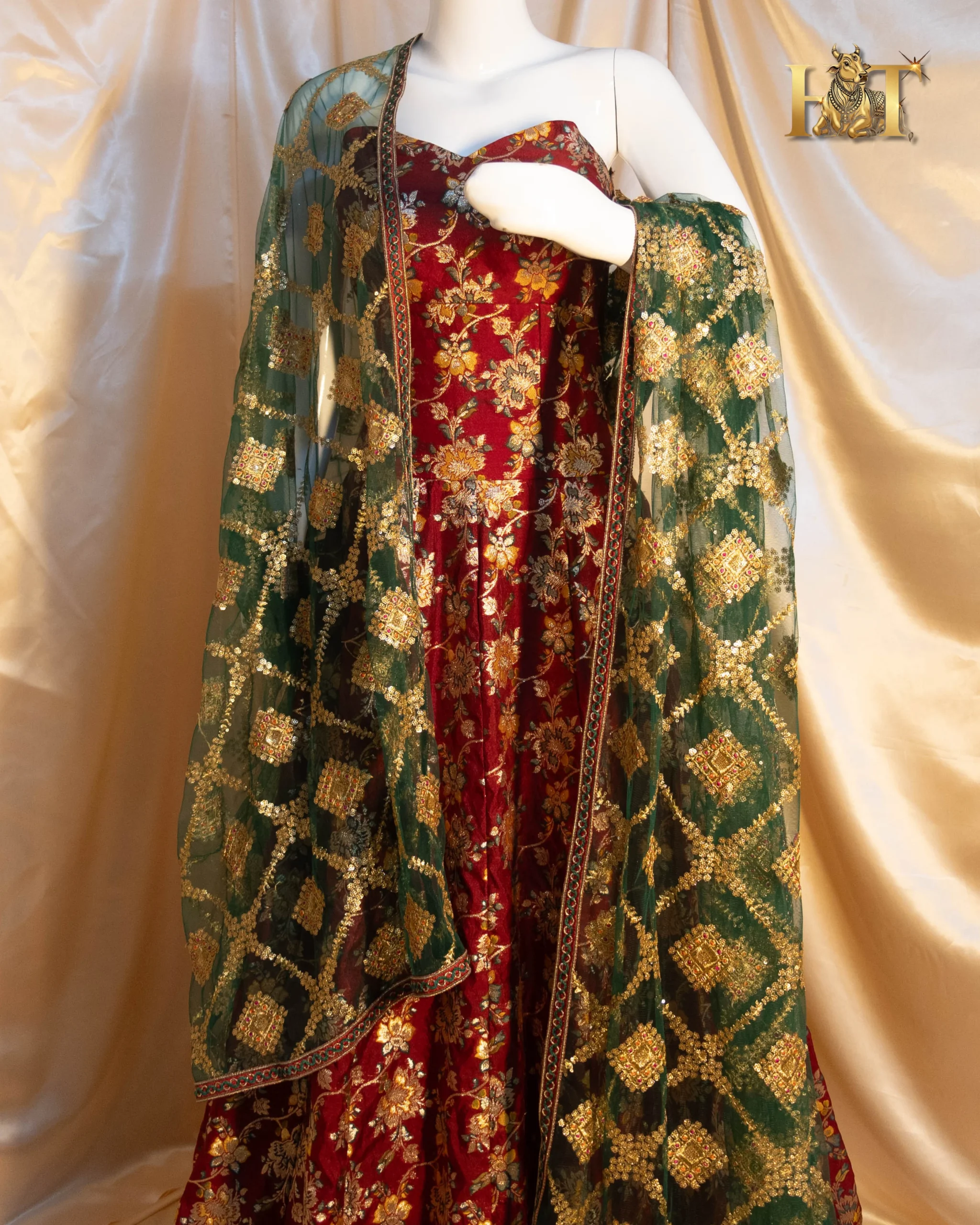 • Color: Deep wine-red lehenga with contrasting emerald green dupatta