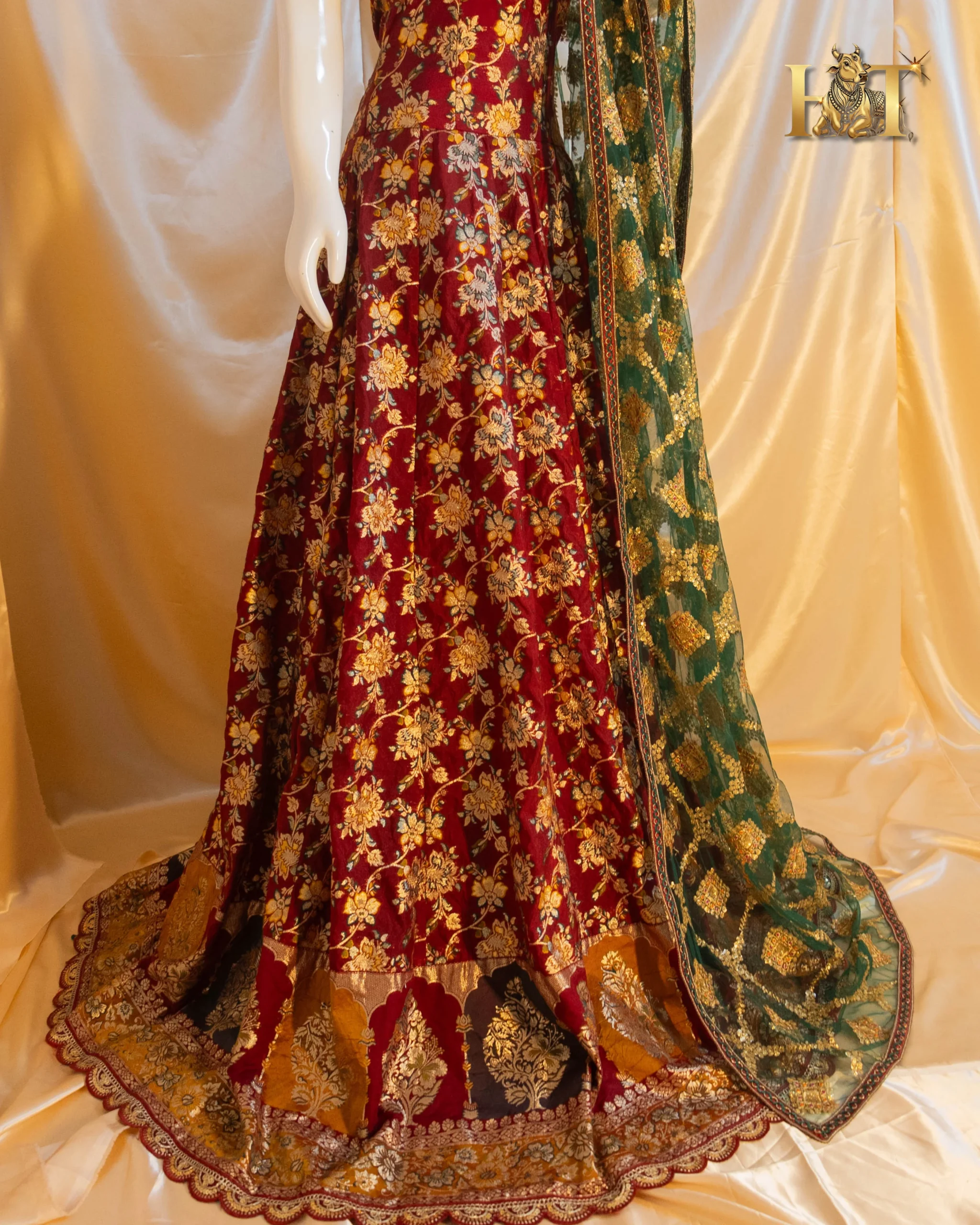 The rich wine-red velvet base exudes royal sophistication, perfectly paired with a contrasting emerald green dupatta adorned in gold zari work, adding depth, drama, and grace to every movement.