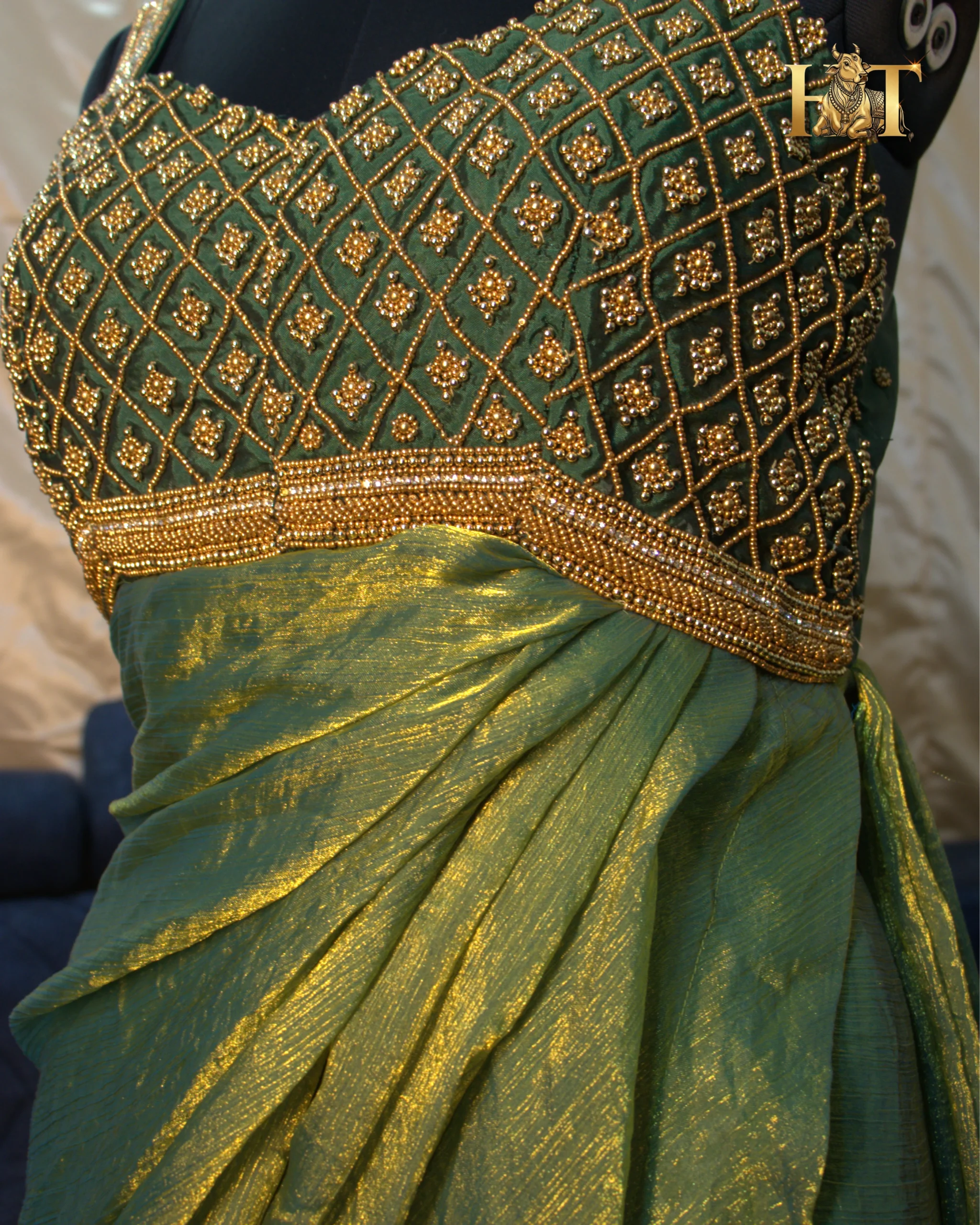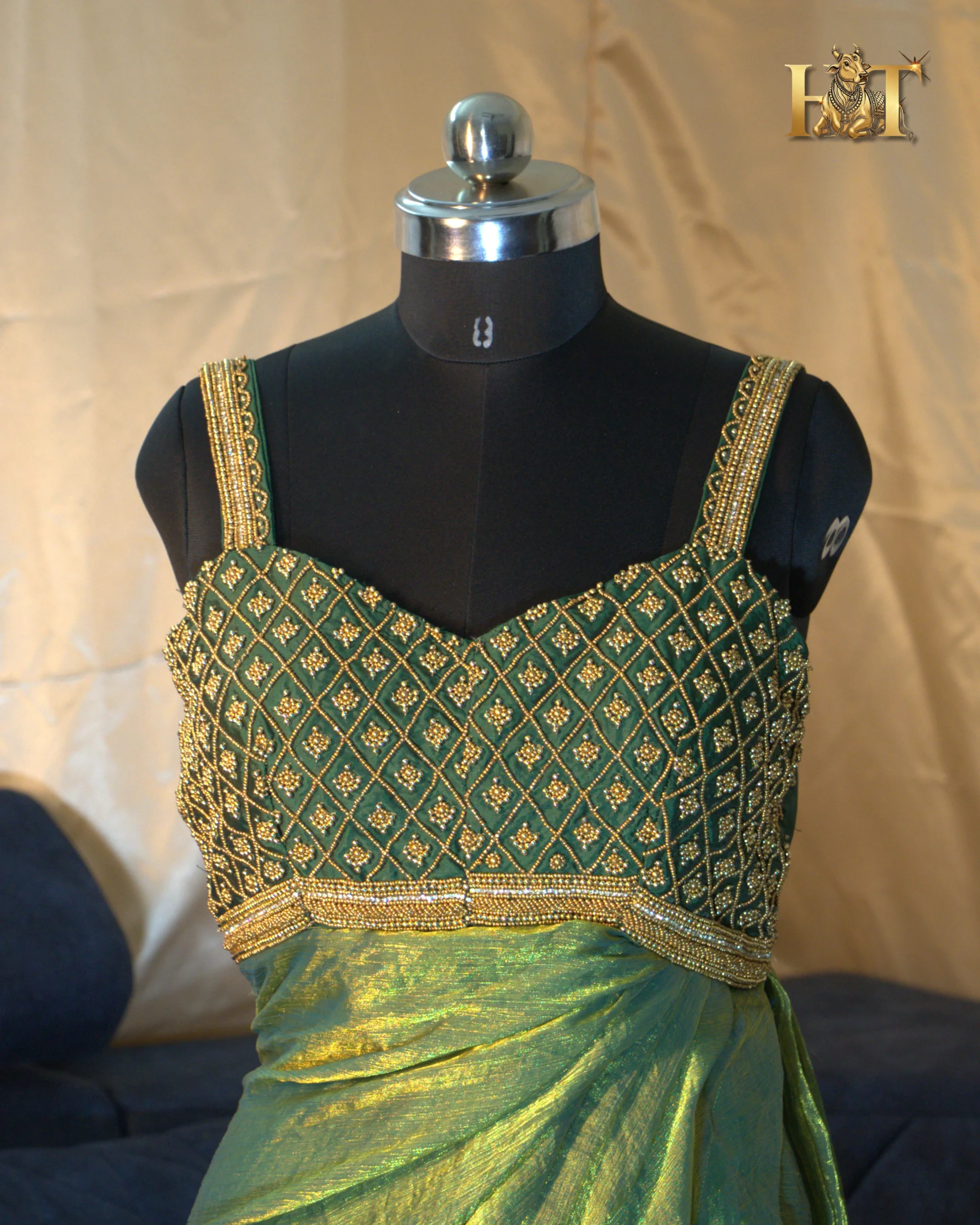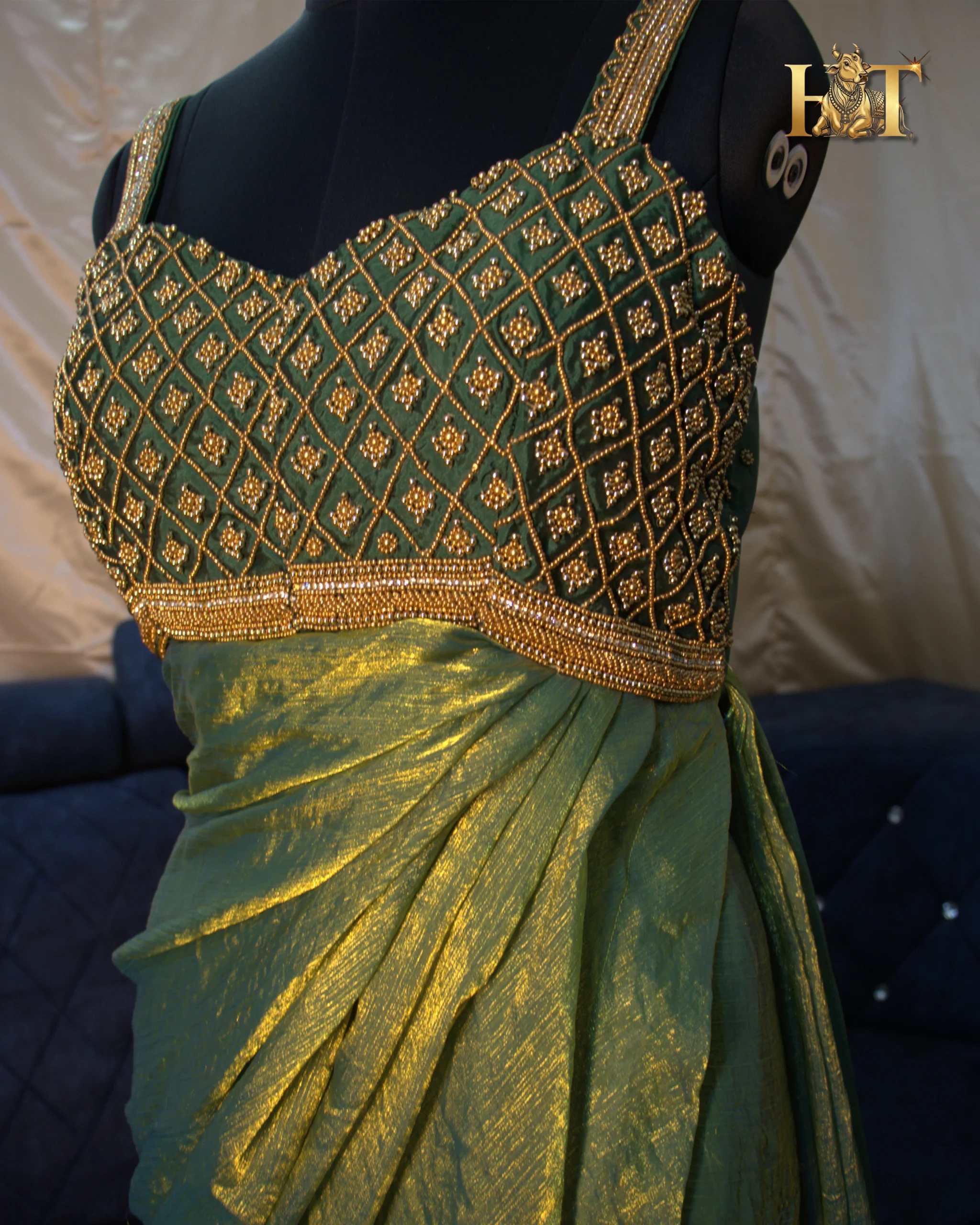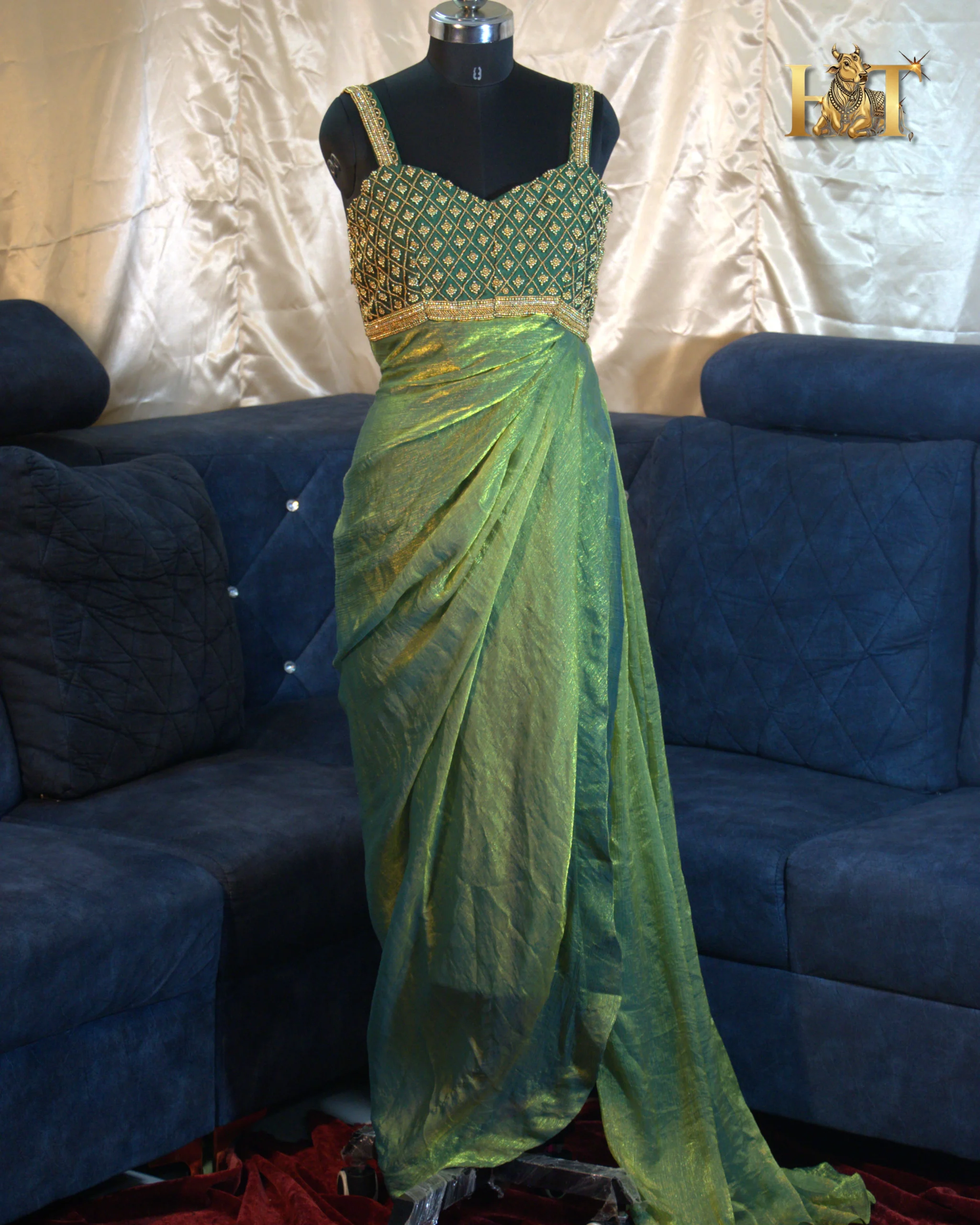 Crafted from rich Raw Silk and adorned with intricate loom craftsmanship, this silhouette features flayered space silk detailing and a dramatic side train, a bold expression of timeless elegance.