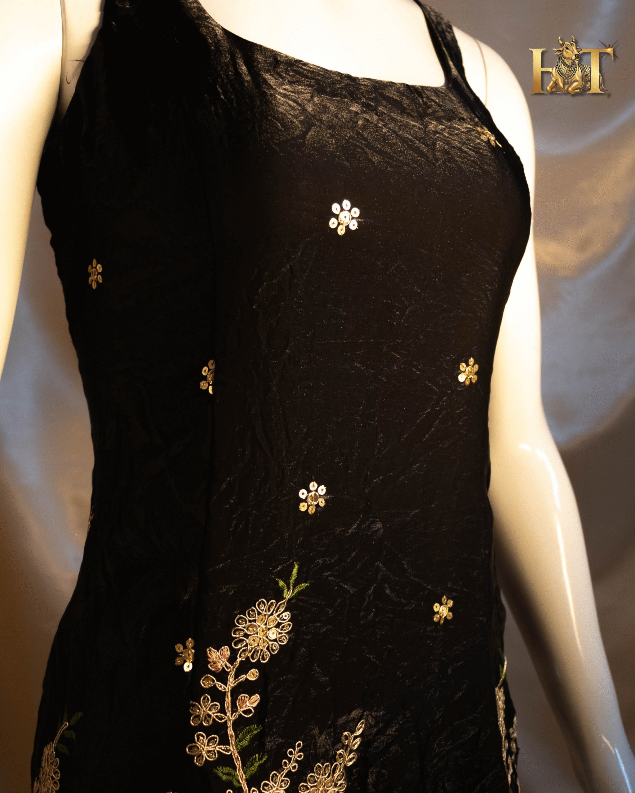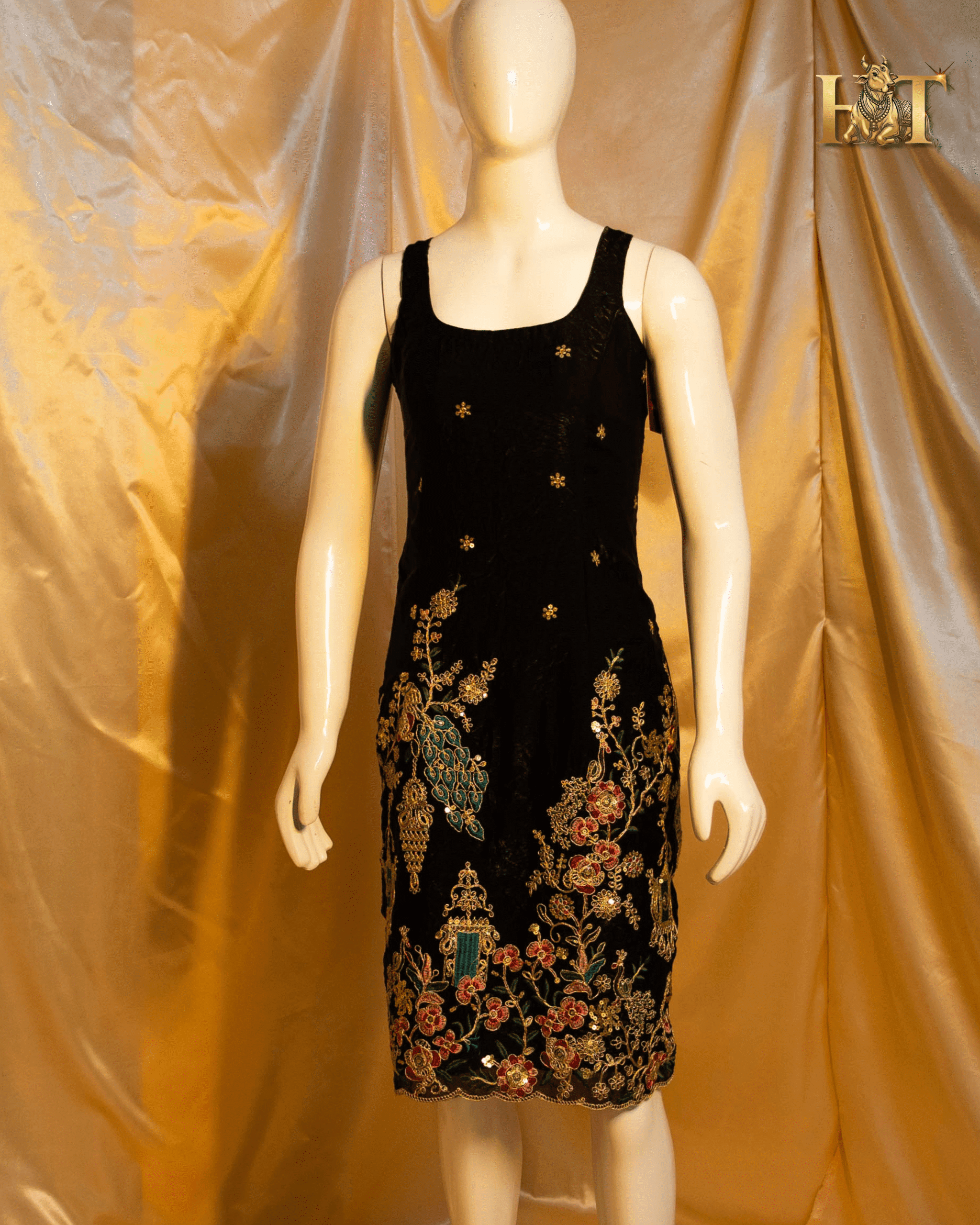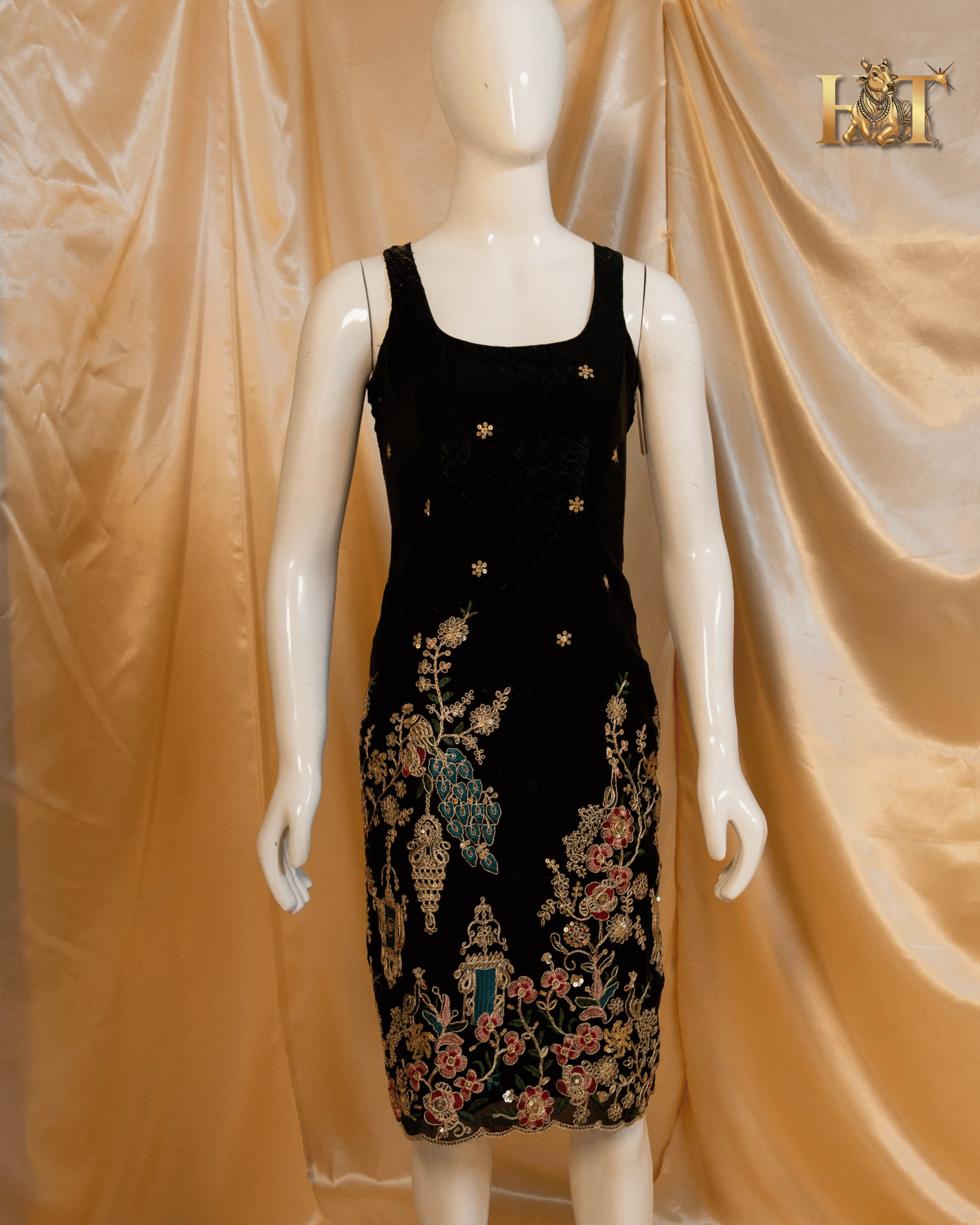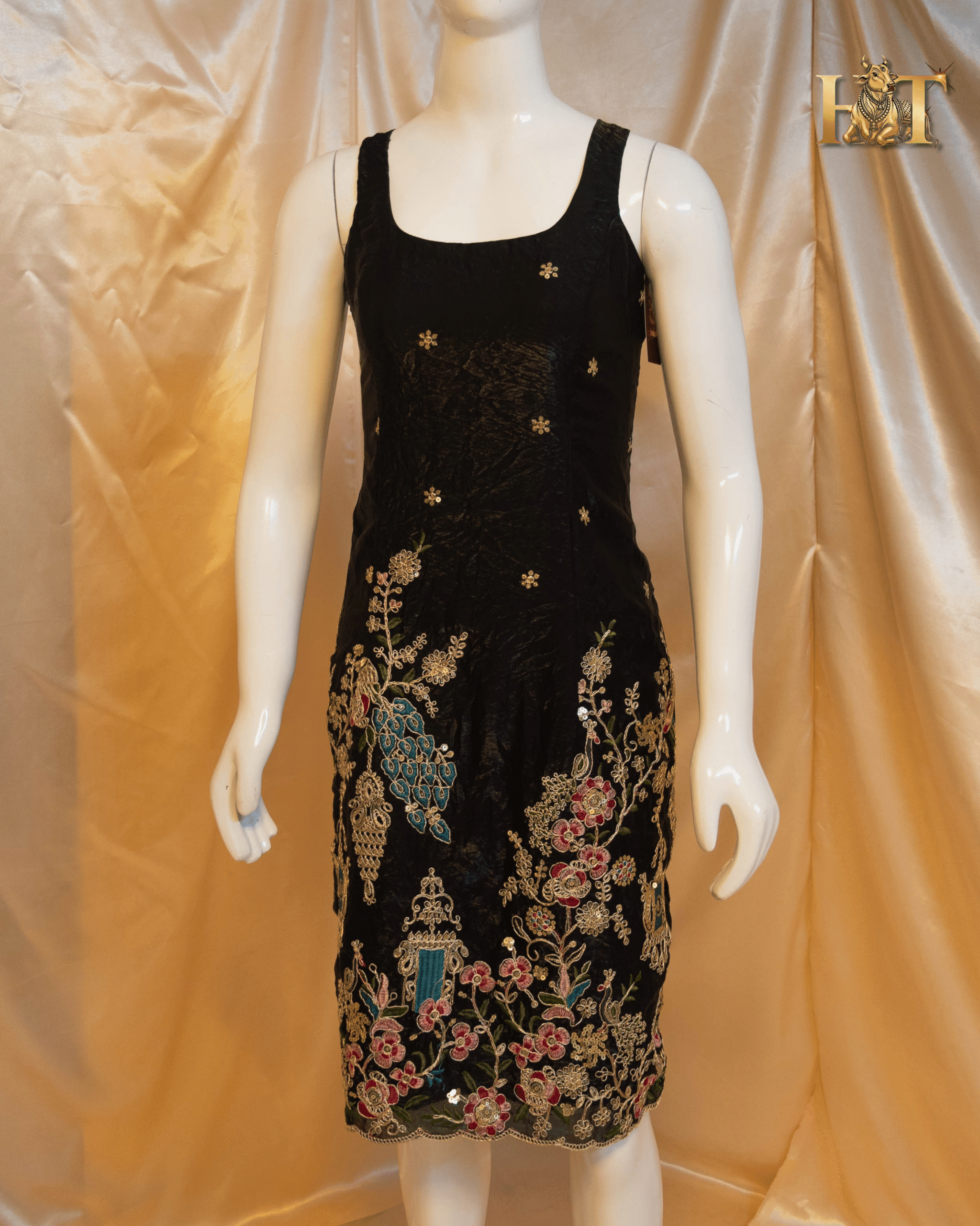 Presenting the "Midnight Mirage" Embroidered Silky Fendi Mini Tunic from Hanumanaguthi's. This stunning piece is designed to make you shine at every special occasion. Crafted from the finest premium Fendi fabric, known for its elegant drape and subtle texture, this dress is adorned with breathtaking heavy embroidery.