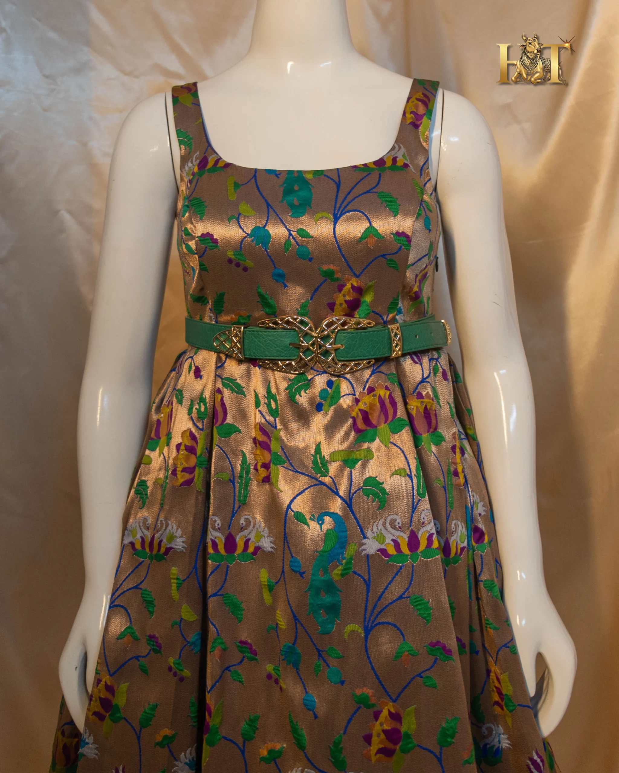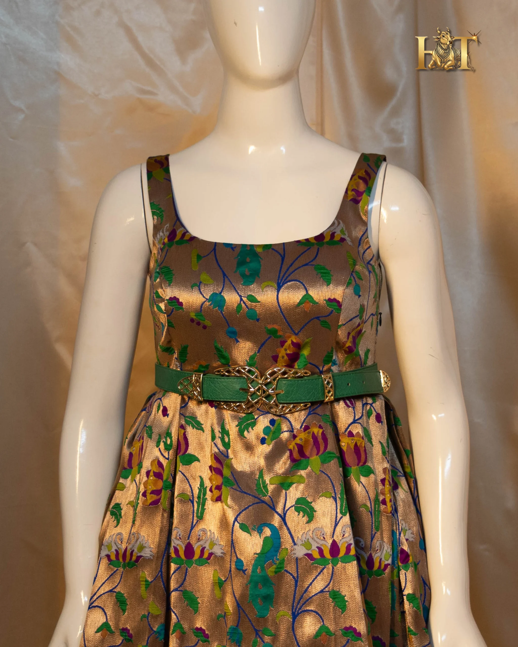 Crafted from authentic Paithani silk, this gown beautifully merges the intricate handwoven charm of traditional Maharashtrian weaves with a modern, western-inspired silhouette. The result, a breathtaking fusion of heritage craftsmanship and couture sophistication.