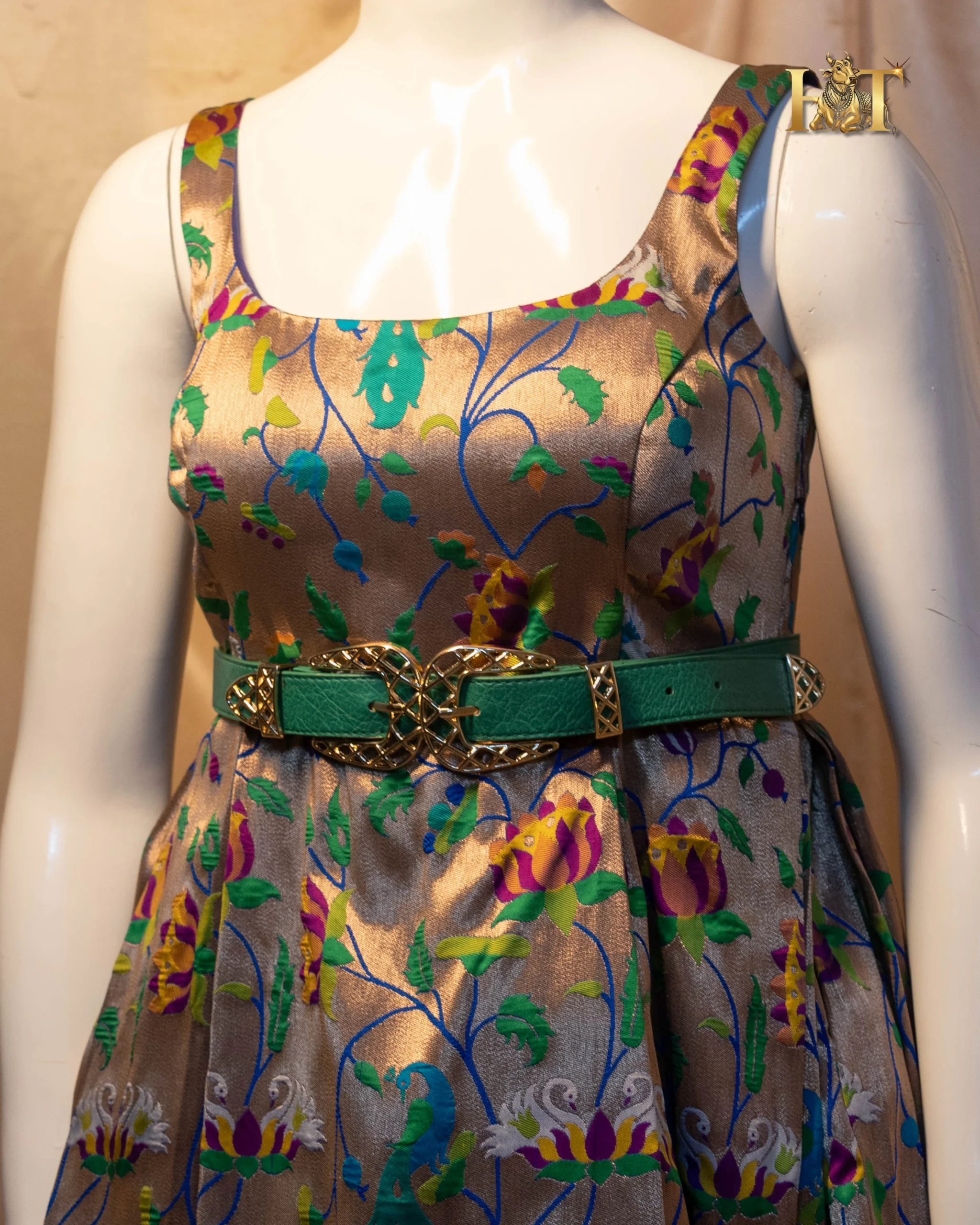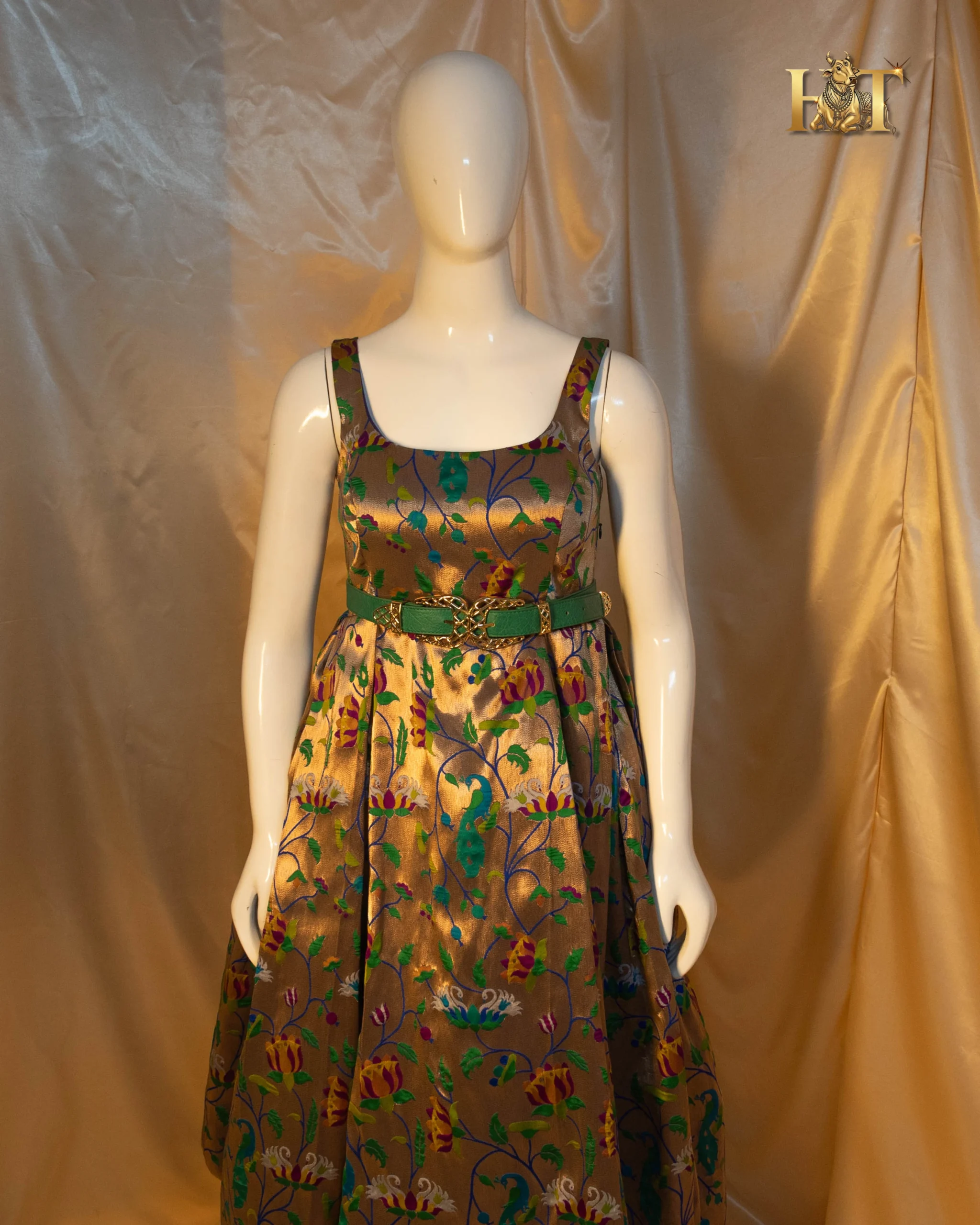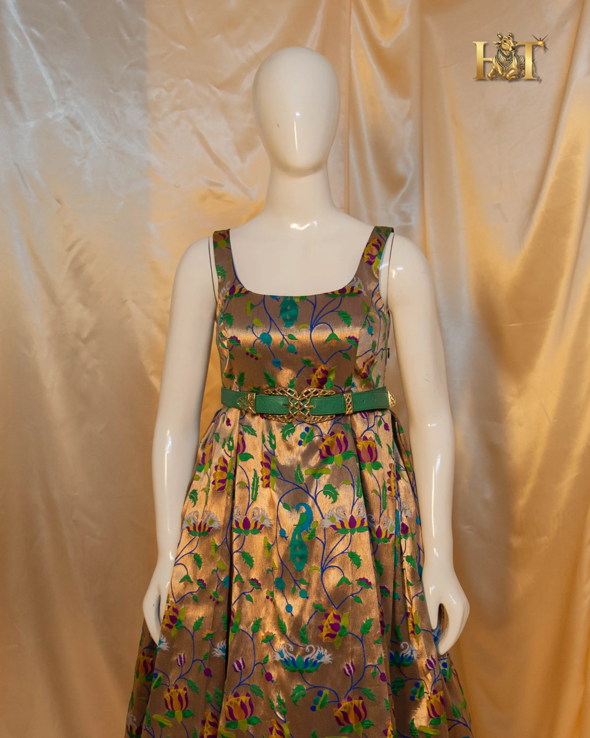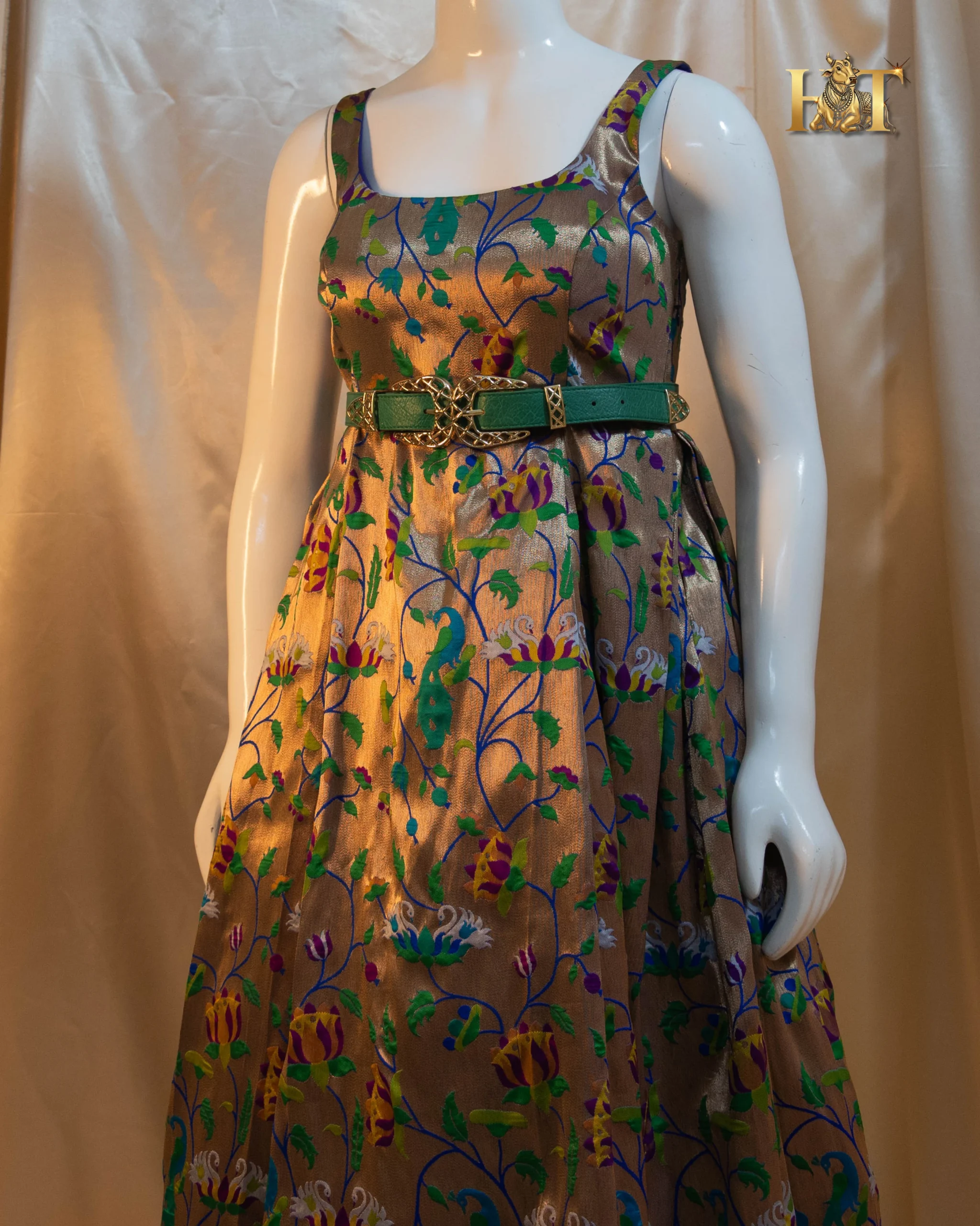 Crafted from authentic Paithani silk, this gown beautifully merges the intricate handwoven charm of traditional Maharashtrian weaves with a modern, western-inspired silhouette. The result, a breathtaking fusion of heritage craftsmanship and couture sophistication.